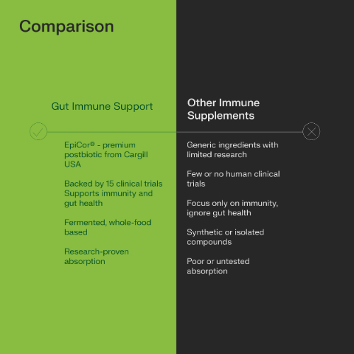 Gut Immune Support is formulated with EpiCor® 500 mg, a patented whole-food fermentate backed by more than a decade of human clinical studies.
